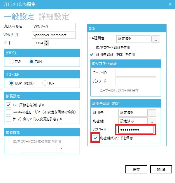クライアント用の秘密鍵にパスワードが設定されている場合は、「パスワード」欄にパスワードを設定して「秘密鍵パスワードを保存」欄にチェック入れることで秘密鍵のパスワードを保存することが出来ます。(セキュリティレベルは下がりますが…)