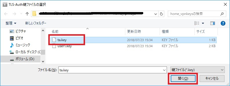 「TLS-Auth共有鍵」(ta.key)ファイルを選択して「開く」ボタンを押下します。