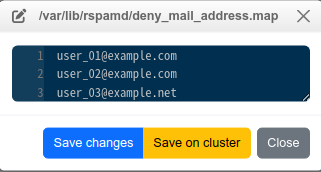 マップファイルを直接編集して、許可・拒否をしたいメールアドレスやIPアドレスを記述します。
