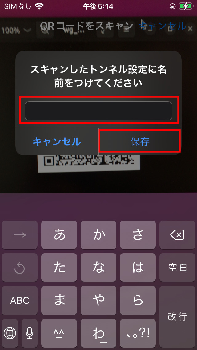 QRコードをスキャンするとトンネル名を設定する画面が表示されるので、名前を入力して「保存」を選択します。